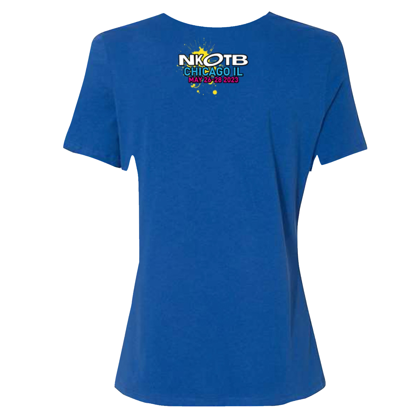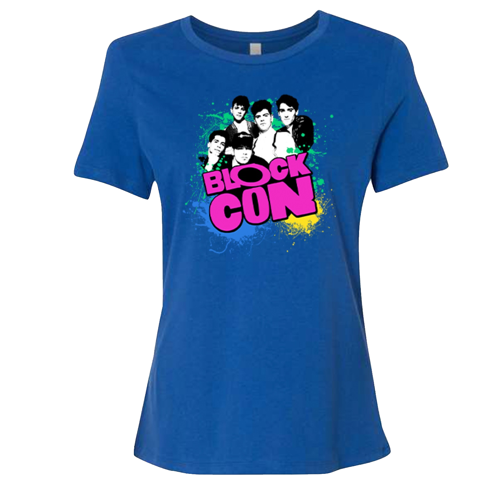 Royal Blue Ladies tee with BLOCKCON splatter artwork on the front