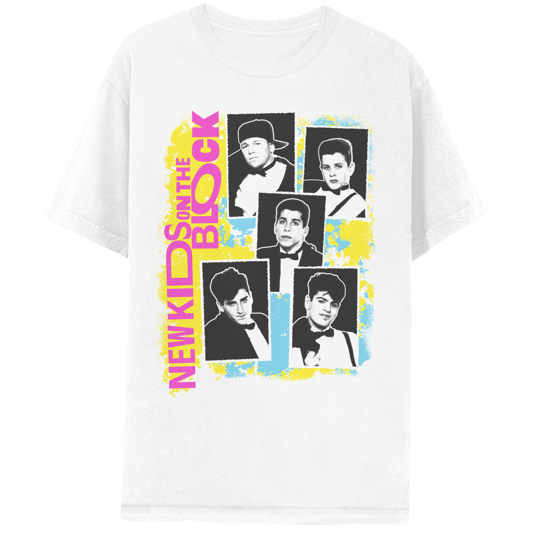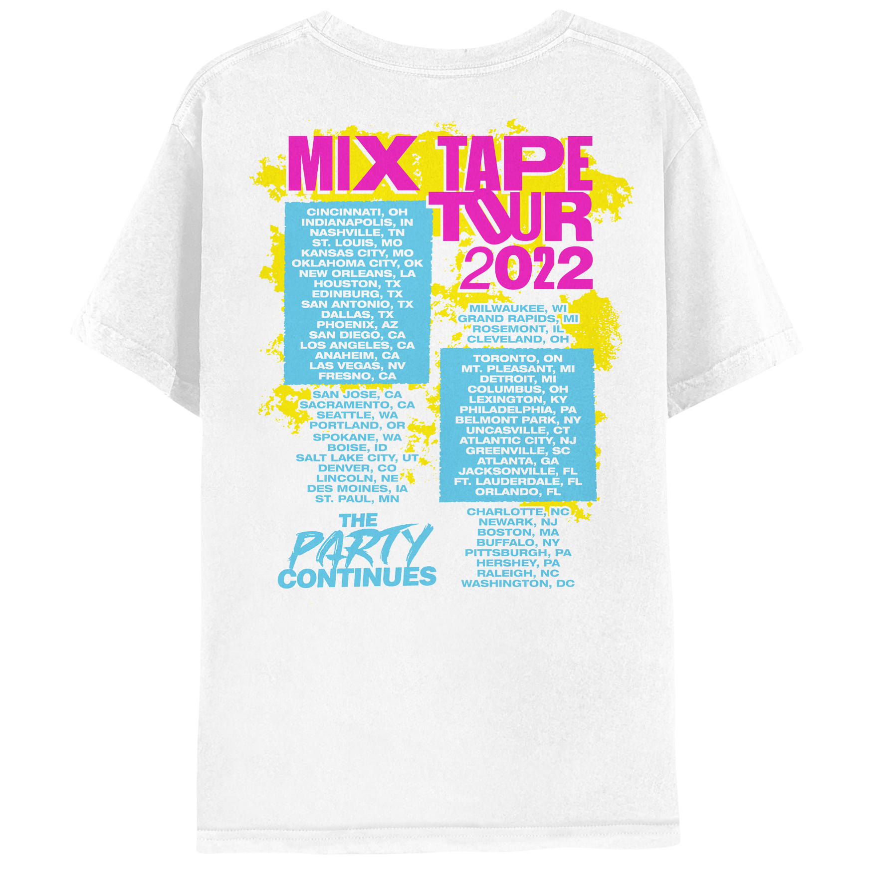 White 100% cotton short sleeve tee featuring NKOTB vintage photo designed artwork on the front and Mixtape Tour 2022 Event cities on the back